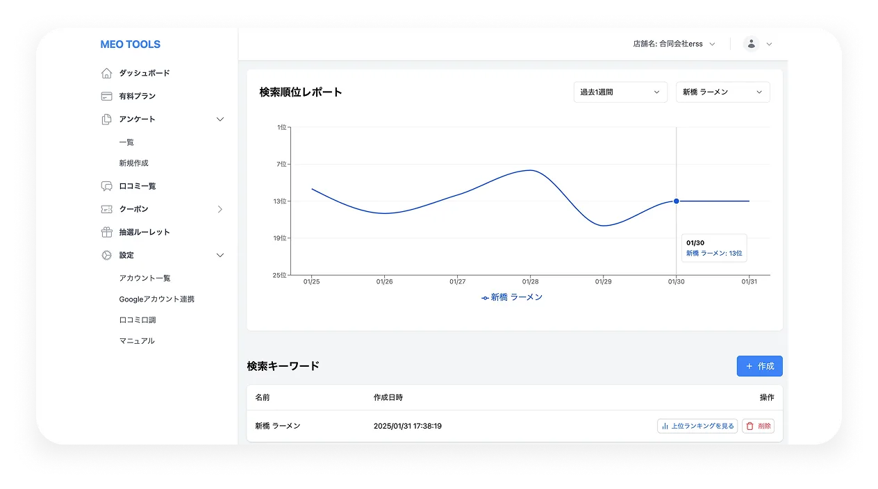 指定したキーワードで自店舗のGoogleマップ順位を自動計測。競合店舗の順位もチェックできるため、MEO対策の改善ポイントが一目でわかります。